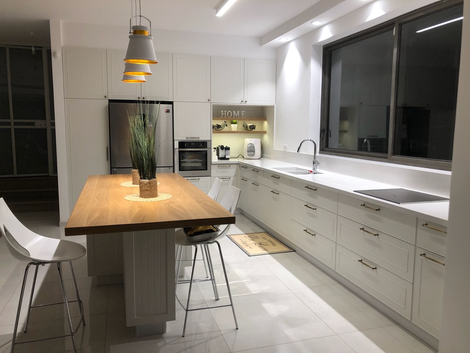 עיצוב נצחי בגוון לבן חם ונעים, דלתות בעיטור עדין ויוקרתי. האי משלב משטח עבודה ושולחן אוכל משפחתי.