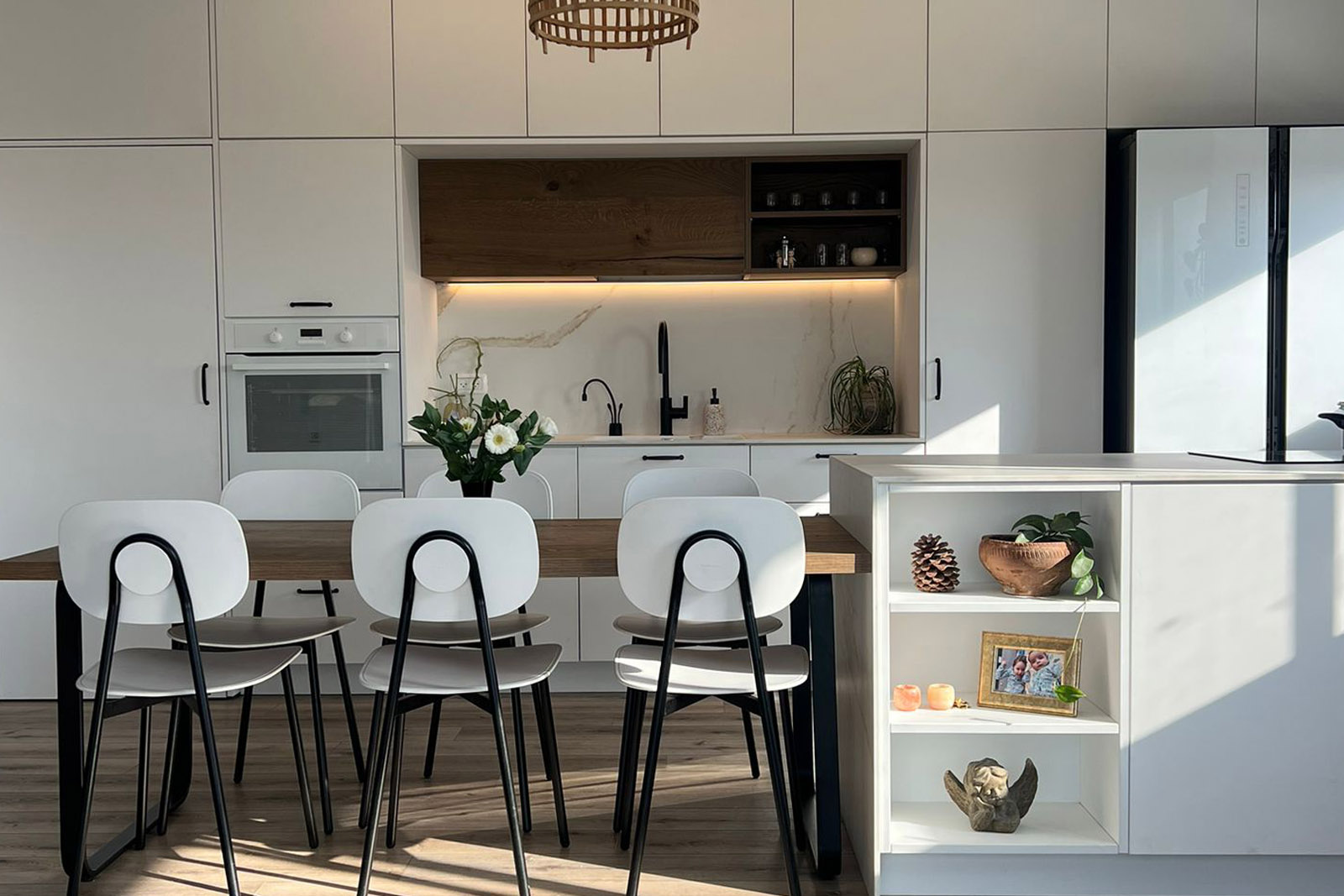 מטבח לבן מודרני ואלגנטי, עם קיר ארונות גבוהים ודלת מעבר נסתרת לחדר השינה, שולחן אוכל צמוד המשתלב כחלק אינטגרלי מהעיצוב.