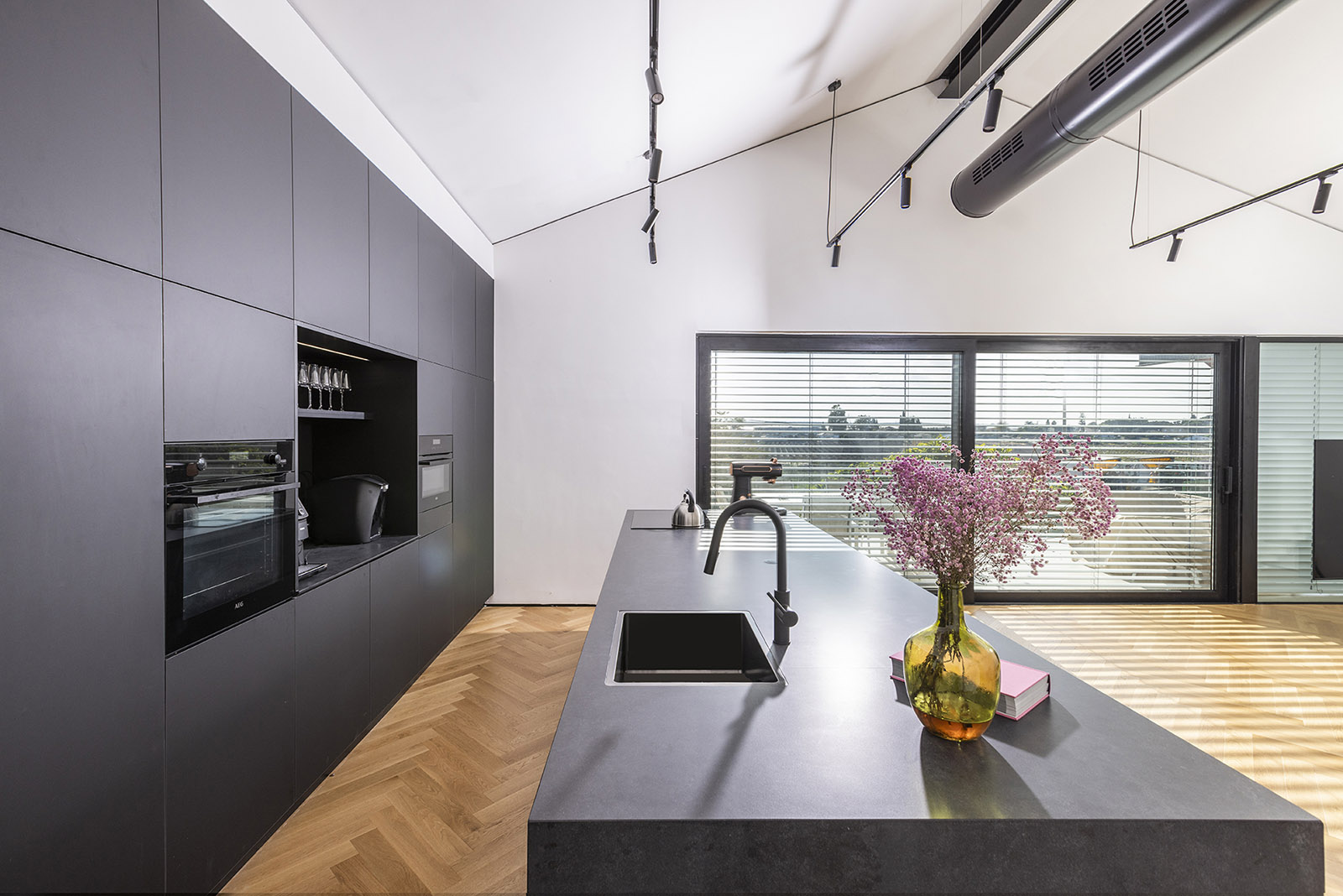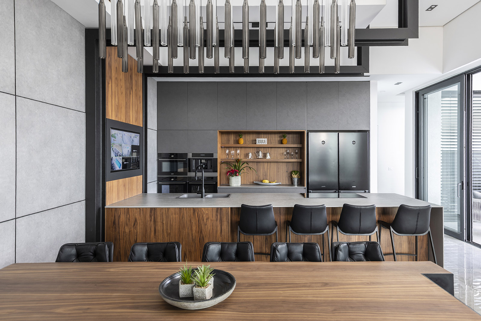 צלן, ובגימורים חלקים מט או מבריק. המטבח שם דגש על אחסון נסתר ואינטגרלי, כולל שימוש בפרופיל במה אינטגרלי ובשילוב מכשירי חשמל מובנים, וזאת במטרה ליצור חזית אחידה ונקייה המעניקה למרחב מראה מסודר, רחב ועכשווי.