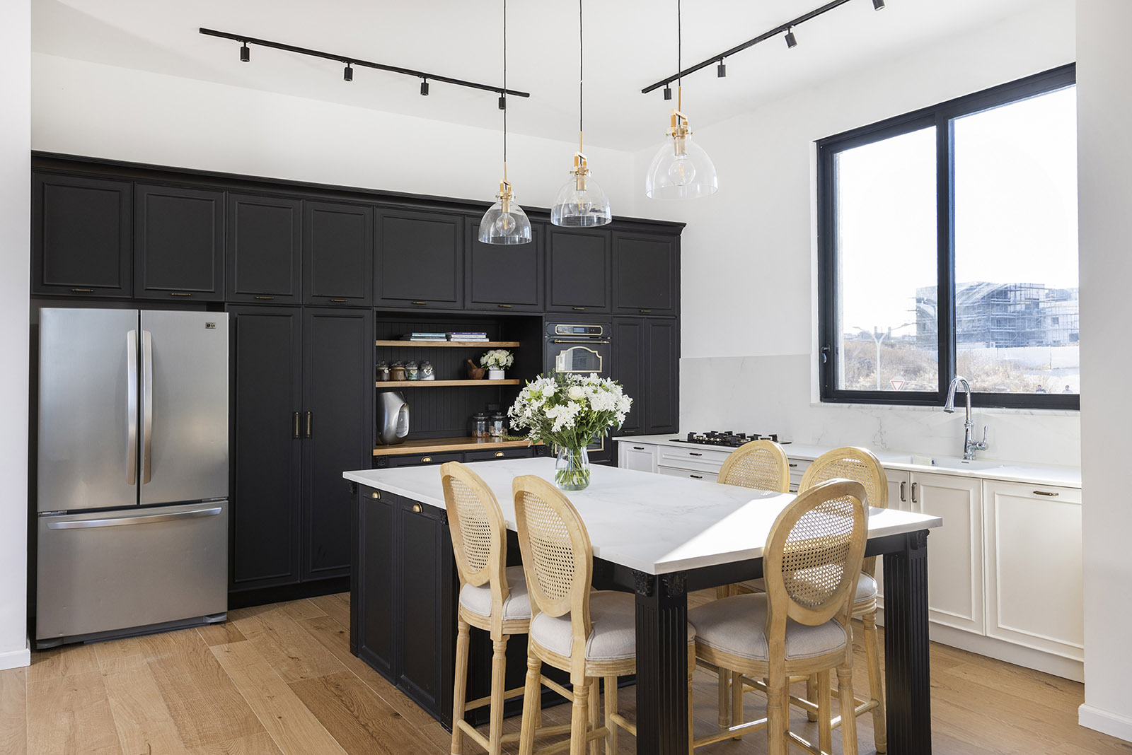 ידיות ברונזה, פליז או שחורות מט הן בחירה נפוצה שמעשירה את המראה ומדגישה את האופי של הסגנון.