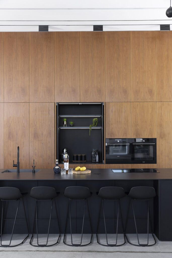 פורמייקה עמידה, זכוכית מחוסמת, קוורץ ועץ טבעי. שילוב חומרים יוצר איזון בין עיצוב לפונקציונליות.