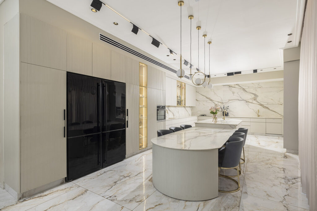 - מטבח מינימליסטי – קווים נקיים, שיש שחור או לבן ופרטי מתכת מעוצבים.
