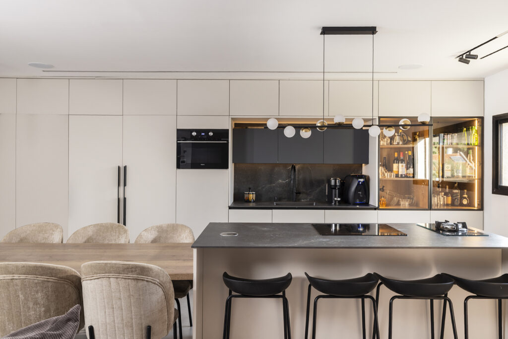 שילוב אחסון חכם, תאורת משטחי עבודה מתקדמת, פרטי מתכת מודרניים ופרופורציות נכונות בין אי מרכזי לארונות, יבטיחו פונקציונליות מלאה.