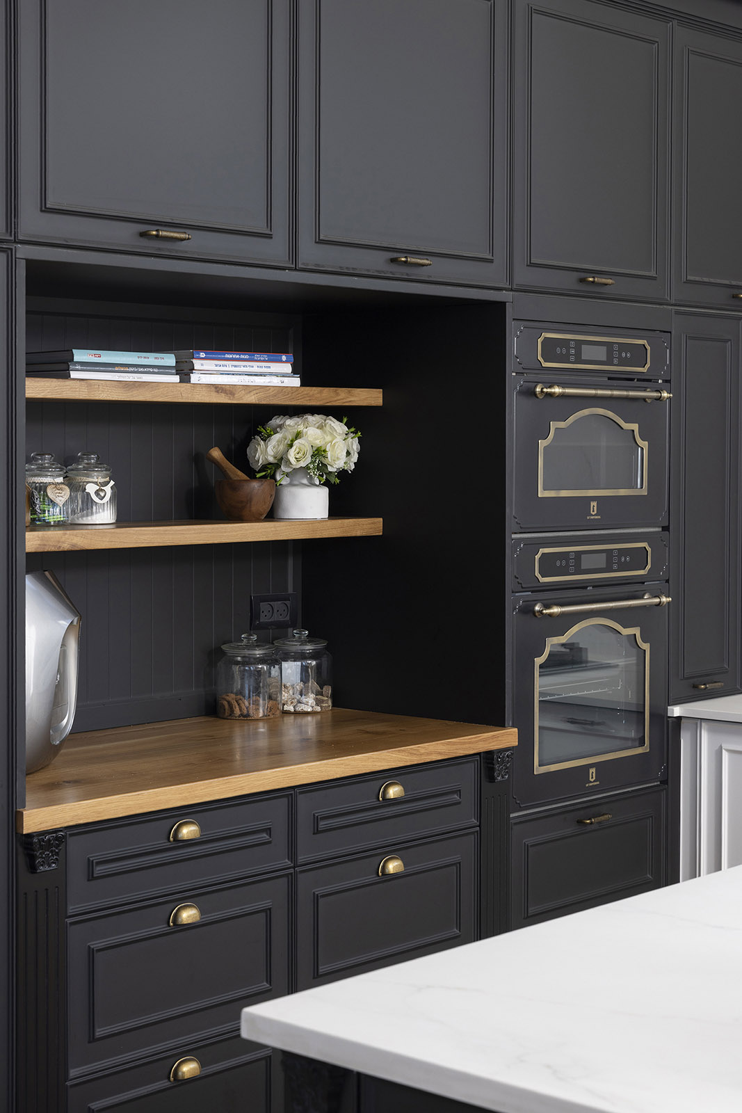 מטבח שחור לא חייב להיות מודרני בלבד. דווקא בסגנון הכפרי הוא מקבל עומק מפתיע. ארונות בעבודת נגרות עם חריטות עדינות, משטח עץ טבעי ומשטח בוצ’ר שחום. כל אלה יוצרים מראה ייחודי שמשלב בין רוך כפרי לבין עוצמה מודרנית.